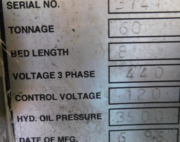 Machine capacity: 60 TONS X 8 FT.